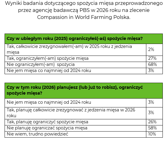 W Polsce coraz więcej osób deklaruje, że w nowym roku chce zmienić swoje nawyki żywieniowe i ograniczyć spożycie mięsa lub całkowicie z niego zrezygnować. Najnowszy sondaż przeprowadzony na zlecenie Compassion in World Farming Polska przez agencję PBS pokazuje, że aż 32% Polek i Polaków w 2026 r. planuje jeść mniej mięsa lub całkowicie z niego zrezygnować.